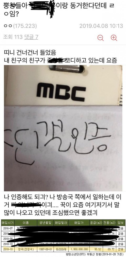 ㅋㅋ 일단 얼마전 매입한 아파트에는 친형이 살고 있으니 타팬들은 낚이지 말아줘. 그리고 너 진짜 용감하다. 이건 백퍼 고소각이고 빅히트 합의 없음. 그리고 어디서 들고와도 주작없이 못사는 남연갤꺼 들고 왔냐. 너 이런거 유포하는것도 고소길인데 하루살이임? 이것들이 저번부터 선을 자유자재로 넘나드네
