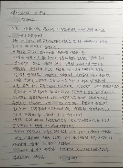 경기도의 한 학부모가 "내 딸은 세월호 추모행사에서 빼달라"는 내용이 담긴 손편지를 담임 선생에게 보내 논란이 예상된다.