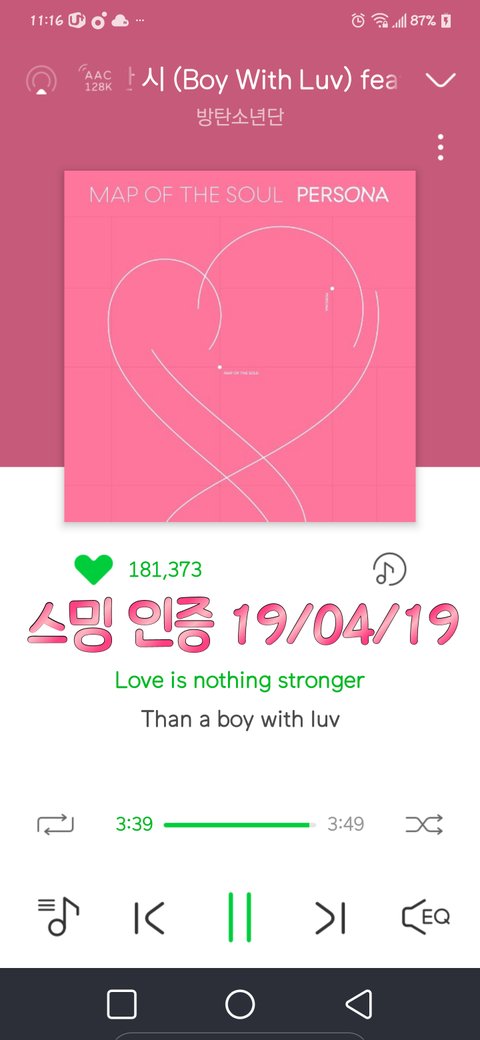 스밍인증 처음 하지만, 사실 존재감 없어도 항상 엄청 듣고 있었어. 탄이들 노래는 일부러 들으려 하지 않아도 내 일부니까. 나의 행복을 위해 듣는 거니까. 아무튼 우리 방탄이들 엄청 좋아하면서도, 성격 탓에 sns도 안하고 혼자 팬톡 보고 영상찿아보고 그랬지. ㅋ 하지만 이번 앨범 정말 너무 좋아서 용기내서 글 써 본다. 무엇보다 슥찌 춤 ㅜㅜ 너무 감동이지 않니 ㅜㅜ 노력했을 거 생각하면.. 혼자만 아는 수고하느라 고생했을 거 생각하면.. 더 응원해주고 싶어서 글 썼다. 나만 탄이들에게 위로 받을 수 없으니. 열정적인 아미들 보면서도 위로 받고 용기 얻는다. 뒤에서 마음으로 방탄과 아미들을 응원하는 머글이가.. 쩜쩜.. 안녕.