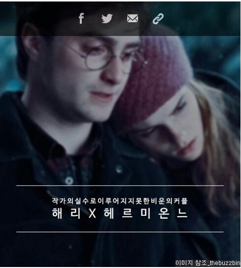 작가 인터뷰 찐인데 인터뷰 내용이 부분만 실려서 정확히 전달이 안 되는 거 같음. 해리포터 쓰는 내내 처음부터 끝까지 론-헤르미온느 계획한 거 맞음. 근데 지나고 나서 보니까 성격을 봤을 때 해리랑 헤르미온느가 더 잘 맞는 커플이었을 것 같다, 론과 헤르미온느를 이어준 건 전남편-본인을 대입해서 그랬던 것 같고 실수였다. 그렇지만 론과 헤르미온느는 아마 부부상담 끝에 잘살 거다. 이런 내용임 인터뷰 전체는.