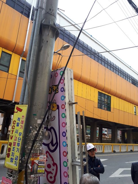 4월13일 저번주토요일에 출근해 보니 돌출간판이 잘려서 길가에 내려와 있었고 다른 돌출간판을 해체하고 있었습니다 비계(아시바)가 저희 전면간판을 가리고 건물전체를 싸고 있었습니다.