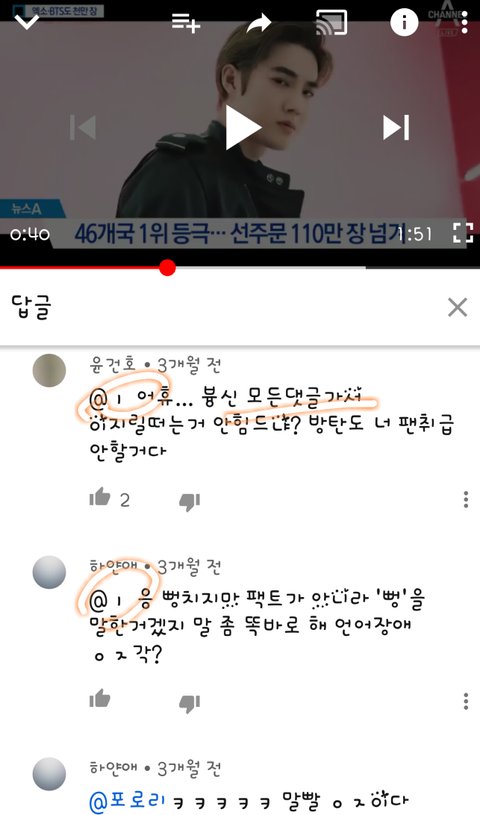 쟤 엑소영상한두개가 아니라 온갖엑소영상에 악플달음