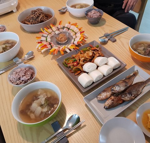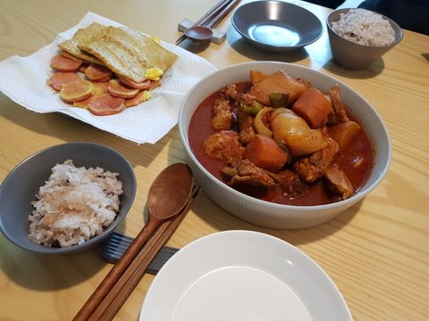 저는 하는일이 밤늦게 끝나 남편이랑 같이밥먹을시간이 아침뿌니없어요 ㅠㅠ 그래서 아침에 같이 먹고싶은걸 먹는편이에요 전날밤에 퇴근하고 미리 만들어 놓은편이구요 ! 그래서 저날아침은 닭볶음탕 키야 국물걸죽한걸 좋아해서 좀 걸죽해용