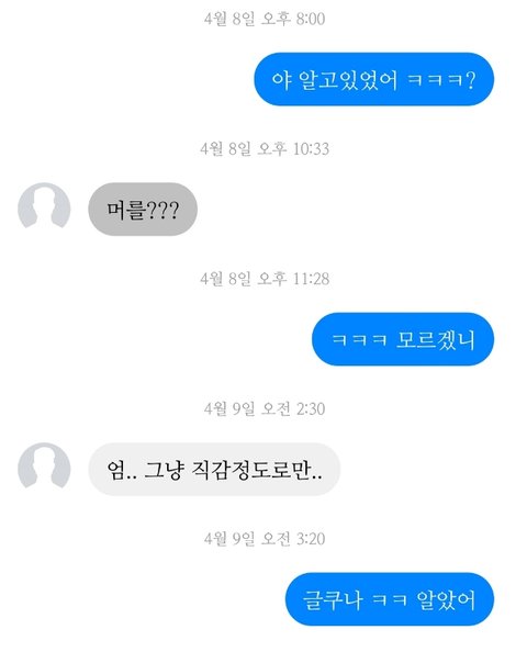 애는 내가 자기 좋아하는걸 이미 눈치깠어 근데 내가 직접 고백은 안했거든