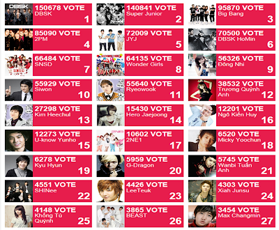 --------------------------------------------------------------- 2011년 베트남 투표 톱1001위 동방신기 2위 슈퍼주니어3위 빅뱅4위 SS5014위 2PM5위 JYJ 6위 두방신기7위 소녀시대8위 원더걸스10위 시원11위 려욱13위 희철14위 여웅재중15위 유노윤호17위 2NE118위 믹키유천19위 규현20위 지드래곤22위 샤이니23위 이특24위 시아준수26위 비스트27위 최강창민