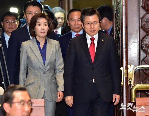 자유한국당 황교안 대표와 나경원 원내대표가 23일 국회에서 열린 긴급 의원총회에 참석하고 있다.