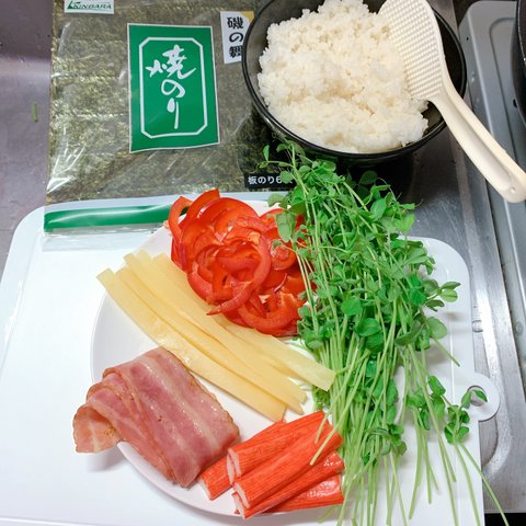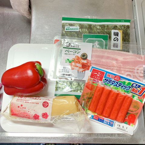 재료 : 파프리카, 베이컨, 김, 게맛살, 단무지, 풀떼기,들기름, 소금 약간,