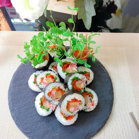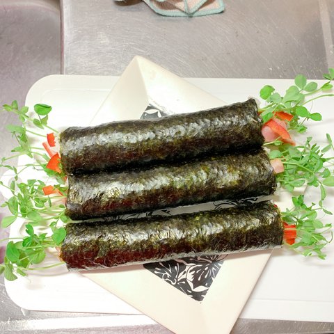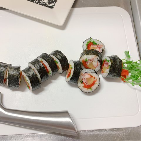 먹기 편한 크기로 자른다.(김밥 많이 싸본 분들은 알거다. 썰기 쉬운법 - 칼을 물에 살짝씩 씻어가며 자르면 깨끗하게 잘린다는 것을)