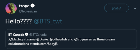 그리고 방탄 지민이었나 정국이었나? 같이콜라보 하고 싶다고 했었나봐 그러니까 트로이시반이 hello? 라고 트윗함ㅋㅋㅋㅋ