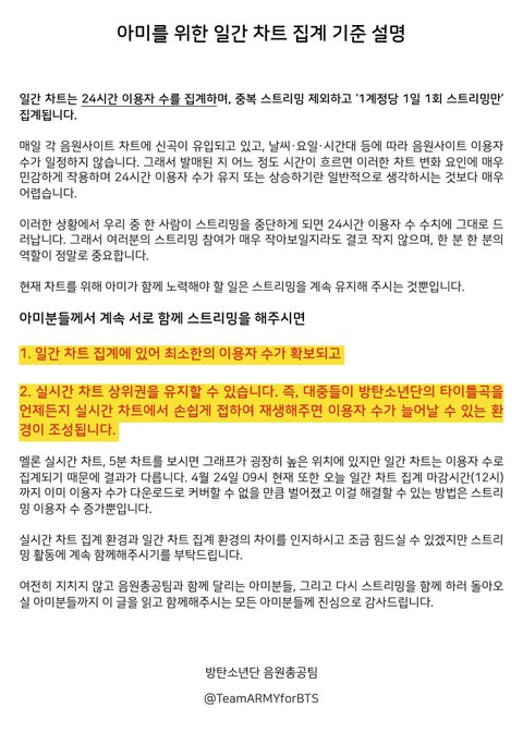 즉, 우리는 하던데로 절대 스밍 손 놓지말고 차트 상위권을 유지하며 더 많은 사람들이 곡을 접할 수 있게 도와야함