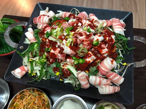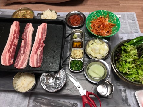 삼겹살입니다.남편이나 저나 삼겹살을 좋아하는데 집에서 먹는게 번거롭긴해도 먹고싶은 야채 싸서 먹기 좋더라구요 ㅎㅎ 삼겹살은 자주 구워먹는 편입니다!