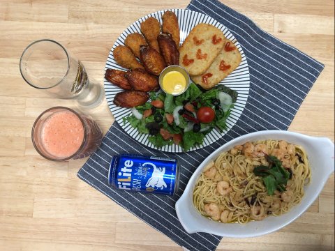 새우 알리오올리오해서 윙이랑 해쉬브라운 에프돌려서 간단하게 먹었어용저는 맥주, 남편은 토마토쥬스 갈아서 줬어요~!!