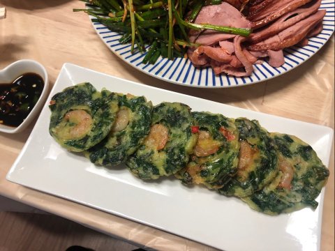 인기 많았던 부추부침개에요.부추넣고 청양고추 다져넣고 부침가루+튀김가루조금 넣어 바삭하게 튀기듯이 부쳐 가운데 새우 넣으면 됩니다!