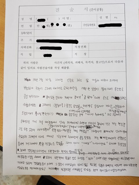 지난 3월 21일 밤 11시경 자동차로 이동 중 타이어가 터져 신림로 362 앞 길가에 차를 세웠고, 보험 회사 직원이 와 제 자동차의 스페어 타이어를 교체하고 있었던 상황이었습니다. 그러던 중 한 남성이 옆으로 다가와 혼잣말로 중얼거리다가 같이 있는 지인(여자)과 제게 "좀맞자"라며 손으로 때리려고 위협적인 제스처를 취하였습니다. 그러더니 물건(몽둥이?)같은 걸 찾는 것 같았고 (이때 저는 112에 신고하는 중이었습니다.) 페트병을 들었다가 다시 버리고 선 제 뒤통수를 가격한 뒤, 제가 부른 보험 회사 직원의 차로 가서 트렁크에서 뭔가를 찾고 있는 듯하였습니다. 뒤통수를 가격 당한 상태였지만, 제 타이어를 봐주고 계신 직원분의 차였기에 "거기서 뭐 하세요 " 라고 했고 가해자는 다시 다가와 손바닥으로 저를 때렸습니다. 같이 있던 지인(여자)은 가해자에게 소리치며 “왜 때리냐”고 하며 저를 막아주었고, 저는 맞다가 찻길로 도망쳤지만 가해자가 계속 따라와 "경찰이 도와줄꺼 같아? 올꺼같아?”라고 하며 저의왼쪽 귀와 머리, 턱 부위를 계속 때렸습니다. 함께 있던 지인(여자)도 저를 막아주던 과정에서 부득이 폭행을 당하였습니다. 그 와중에도 가해자는 저를 타겟 삼아 계속 때리려 하였고 저는 왼쪽으로 가드를 하다 보니 왼쪽 팔꿈치를 계속 맞게 되었습니다. 저는 계속 맞는 상태였기에 막느라고 아무 말도 못하였고 옆에 있던 지인(여자)이 큰 소리로  "가세요" "가시라고요" 라고 하니까 도망갔습니다. 너무나도 억울했고 내가 왜 맞아야 하는지 이유도 알고 싶었습니다. 하지만.. 여자 둘이 상대하기엔 역부족이었습니다. 무섭고 두려웠지만, 저 사람을 그대로 둔다면 2차 피해가 발생할 수도 있었다는 판단이 들었고 저는 가해자를 먼발치에서 쫓아갔습니다. 가해자는 버스정류장에 서있었고 여전히 지나가는 행인들에게 “맞자” 라며 위협을 가했습니다. 경찰관들이 현장에 오기까지는 시간이 걸렸기에 11시 8분경쯤 저는 다시 한번 112에 전화하여 가해자가 서있는 버스정류소의 번호를 알려드렸고 3분 정도가 지났을까 경찰관들이 와서 현행범으로 체포를 하였습니다. 아래 사진은 경찰서에서 작성한 진술서입니다.