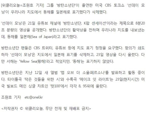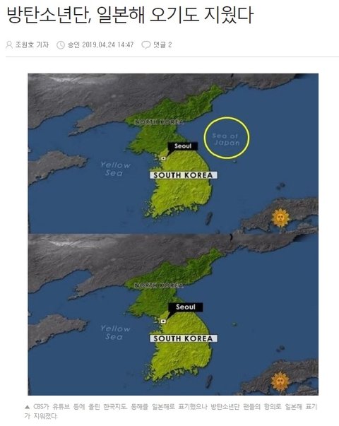 외국 아미들이 선데이 모닝이 동해를 일본해 라고 한거 항의해서 지워졌어