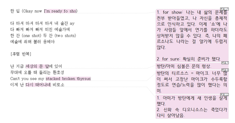 어제 남준이 라이브 보고 정말 곡 하나하나 가사 한 줄 한 줄 꼼꼼히 읽고 싶어서 셤공부 하듯 읽어봤어. 근데 이건 어떤 아미1의 독해일 뿐이니까 그냥 투표스밍 중에 심심할 때 가볍게 봐조
