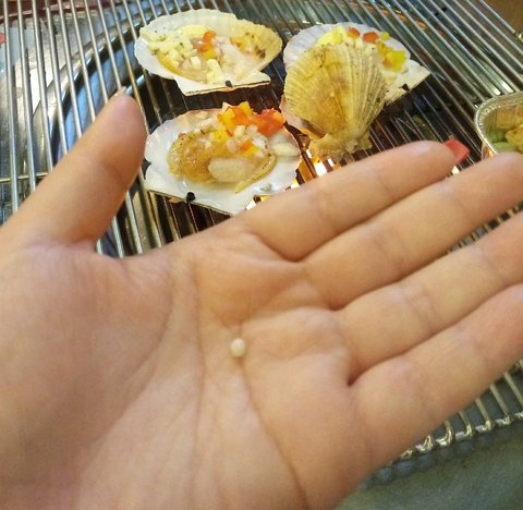가리비에서 나온거 같은데... 조개껍데기인줄 알고 뱉었는데 진주가 짠~~