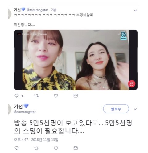 덕질하는사람이보기에 그냥웃긴드립같은데? 만약에 내본진이 뷔앱하면서 모야 스밍안하고 십만명이나보고있어? 이런거자너 ㅋㅋㅋㅋㅋ 기엽고만