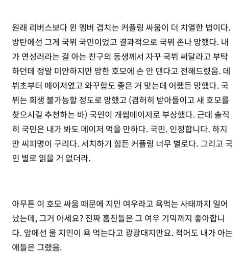 뭐가 메이저인줄 몰라서 포스타입에 이것저것 검색하다 각 팬덤 알페스 분석? 하는 글을 봤는데 이거 찐이야? 진짜 지민이 이렇게 욕 먹었어? 나 늦덕인데 지민이 최애거든...