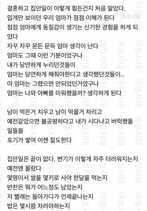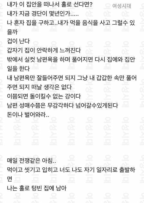 본인위주로 글을 썼겠지만.. 육아 반반 안하는건 남편 잘못이지만 전업주부에 애들은 어린이집이든 유치원이든 학교든 다니는 상태고 전업주부면 집안일은 다 해야지. 너무 본인위주로 써놔서..그래도 밖에 바람쐬며 남편험담할 티타임이라도 있는게 어디에요 남편은 힘들게 일하고 와서 밤에 컵라면 먹고 주무셨네요.
