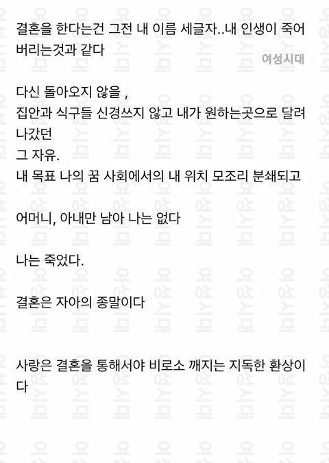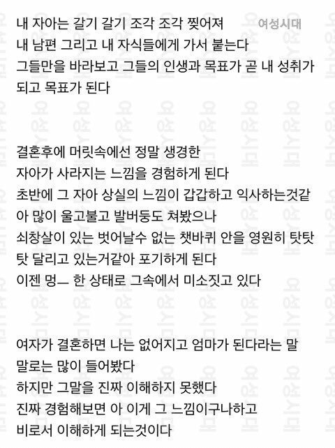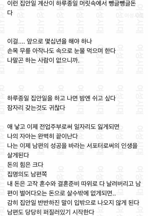 왜 집안일, 집안일 안하고 노는 여자에 초점이 맞춰지는건지... 지금 핵심은 자작이니 아니니가 아니라 결혼으로 인해 한 여자가 본인의 자아를 상실한다는거에요. 솔직히 결혼하신 여성분들은 알거임. 그래서 맞벌이를 해야하고 딩크로 살아야 함. 아님 평생 혼자 살거나.