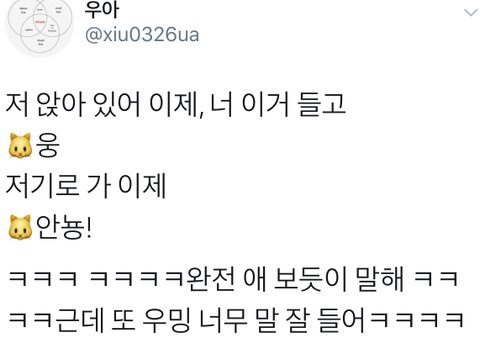 친구가 요알못 겸둥이 시우민보고 아기 달래듯이 "저 앉아있어 이거들고 저리로 가" 하니까 말잘듣는 아기처럼 "응 안뇽" 하는거 넘나 귀엽다능ㅠㅠㅠ
