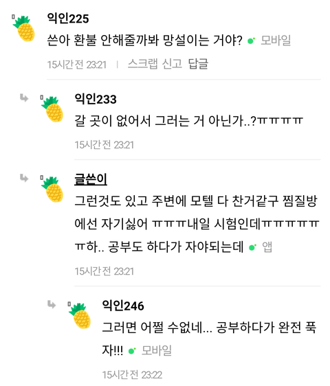 아니 조언을 들었으면 뭐 그에 따른 조치를 취해야할거아닌가?? 다른모텔을 알아보던지 환불요청을 하던지... 만약 돈이 문제라면 피시방을가던지 24시간카페가서 염치없지만 날새기를 한다던지...(어차피 공부하다가 쉴거라고 했으니 겸사겸사)