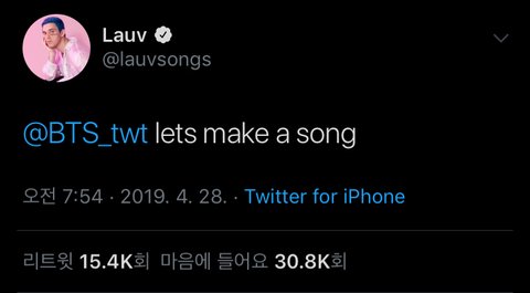 참고로 Lauv는 요즘 Paris In The Rain으로 유명한 가수야!! Never not 이랑 I like me better 도 엄청 좋고 얼마전에 트로이 시반이랑 같이 부른 I’m so tired 도 띵곡이야 한번 들어봐!!만약 진짜로 콜라보가 성사된다면 곡퀄은 안봐도 씹상타치다