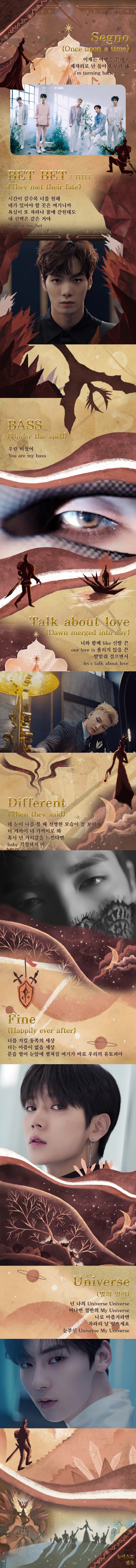 '옛날 옛적에' 뉴이스트 팬톡 동굴에 러브들이 살고 있었어요. 집 나간 러브들은 우리의 'Segno'로 돌아오고 있죠. '거부할 수 없는 운명을 마주친 그들'은 뉴이스트에게 인생을 'Bet Bet' 했어요. 러브들의 영업에 엔터톡 유저 분들은 '주문에 걸린듯' 세련된 전자 음악단의 새 앨범을 듣고 심장을 두근거리게 하는 'Bass'에 홀렸어요. '새벽이 밝아 와도' 귀에 꽂혀 뉴이스트와 'Talk about love'. '그리고 그들은 말했어요'. 뉴이스트는 뭔가 'Different'라고요. 러브들은 '영원히 행복하게' 노래할 뉴이스트의 'Fine'까지 응원합니다. '긴 여정 끝에' 'Universe'를 건너 만난 우리의 가수들이니까요. 4월 29일 늦은 6시, 뉴이스트에게 인생 'Bet Bet' 하러 함께 가시죠!
