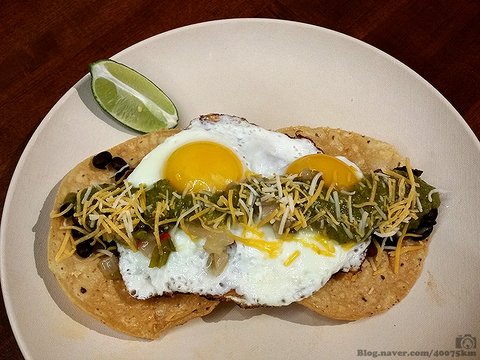 튀긴 또띠아 위에 멕시코식 콩요리, 살사 소스, 각종 치즈와 달걀을 얹어 먹습니다.