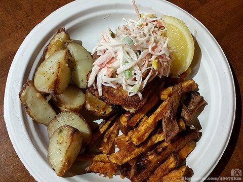 마지막으로 먹었던 피쉬 앤 칩스. 프렌치 프라이와 웨지 감자에 생선 튀김을 곁들여서 서빙합니다.