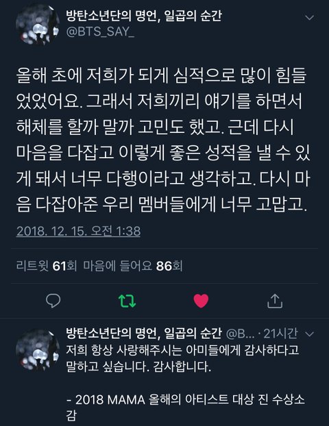 그 힘들었다던 2018년 초 리더가 아미에게 전했던 말