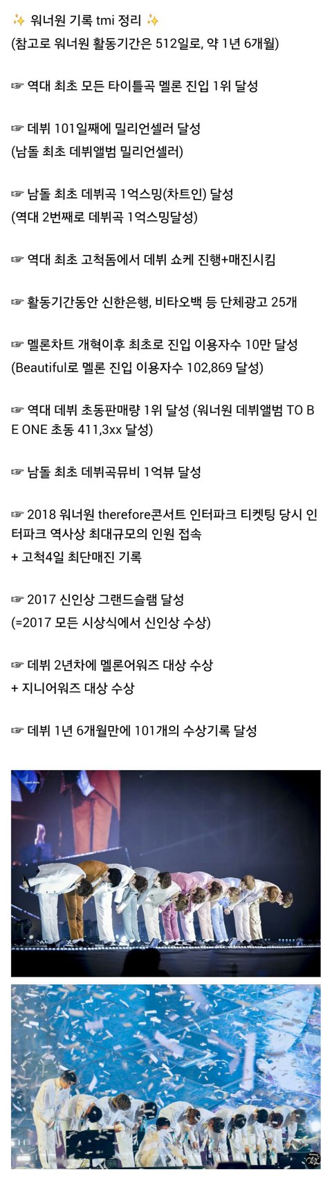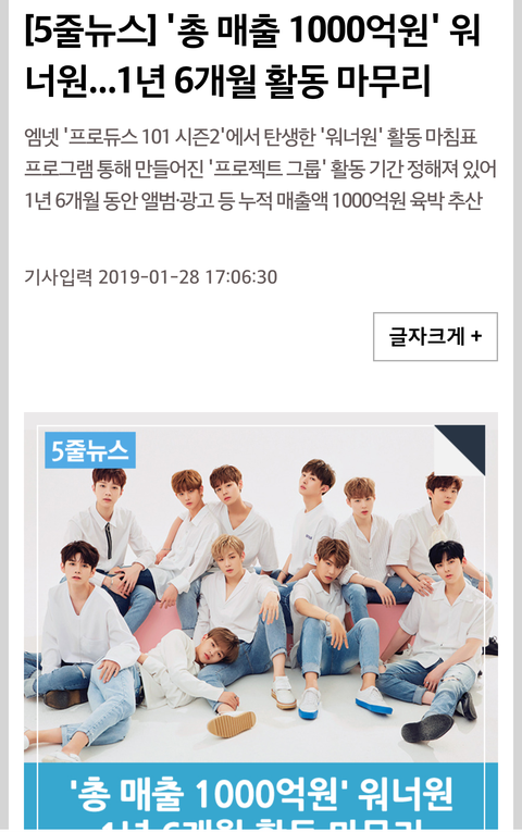 이미 해체전에 1000억 매출달성이라 쓰니보단 잘 살거구 워너원 애들 근황 좀 봐봐 아직 해체한지 4개월됐는데 벌써 스케줄 난리났다♥♥♥김재환 저번주 불명 우승했고♥옹성우 현재 드라마 촬영중 갠광고 4개? 인천교육청 홍보대사♥박지훈 현재 드라마 촬영중 갠광고 3개? 환경부 기후변화 홍보대사 솔로데뷔앨범 초동 9.5만장이고 10만장 넘김♥하성운 스브스신규예능 나오고 솔로데뷔앨범 초동 6.8만장 멜론 월간차트 2개월 들었구♥박우진이대휘 그룹준비하면서 엠넷렬리티 나오고♥황민현 나혼산 나옴ㅇㅇ글쓰니 인생은 얼마나 망해서 워너원한테 열폭하는지 궁금하네ㅋㅋㅋ