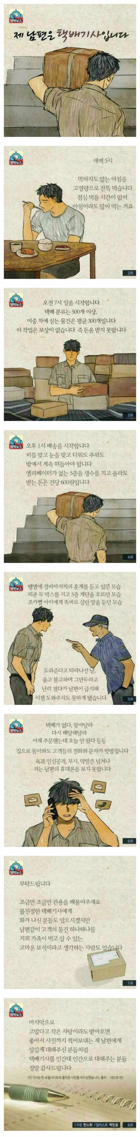 문제는 택배일 하는 사람을 '하인'보듯 하는 개념 없는 무식한 인간들 때문이다. 저분들이 없으면 편하게 앉아서 받을수도 없고 인터넷 주문도 꿈도 못꾼다. 내가 편하기 위해서라기 보다, 인간적으로 다른 인간에게 그냥 '친절'하게 대하는 마음가짐이 중요하다.