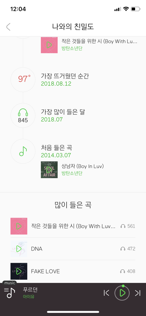 내가 방탄 한노래만 많이듣는 스타일아니고 여러가지노래 골고루 많이들어서 제일 많이들었던 노래도 500번 정도인데(라이트팬) 이번 타이틀은 2주만에 560번 들었네..