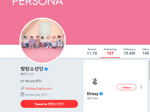 남준이 드레이크 짱팬인데 맞팔이라닠ㅋㅋㅋㅋㅋㅋ 성덕이다 성덕ㅠ 그런 의미에서 우리도 맞팔하자 소년단...