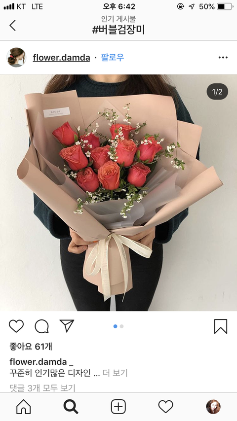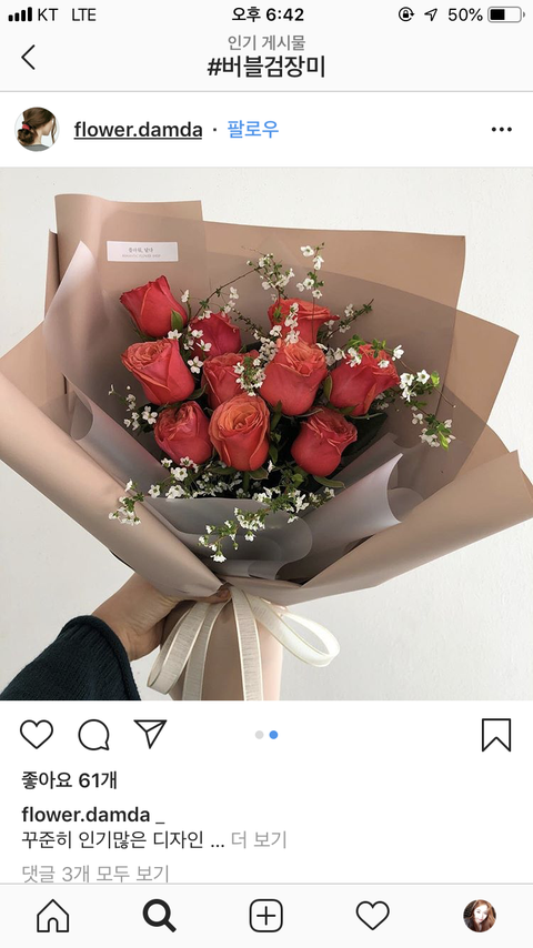 인스타에서 맘에 드는 꽃다발 사진 몇장을 캡쳐하여 사장님께 보여드림