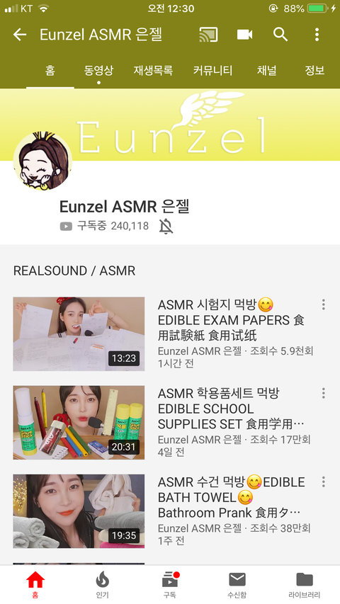 이분은 한국 최초로 이어이팅을 영상으로 만드신 분이야! 약간은 보수적인 우리나라에서 첫 시도를 하신거지 ㅎㅎ 이분은 영상을 프랭크 위주로 올리시는데 아이디어랑 표현력이 아주 좋음!! 아 먹는딱풀 알지? 이것도 아마 은젤님이 최초이실거야!
