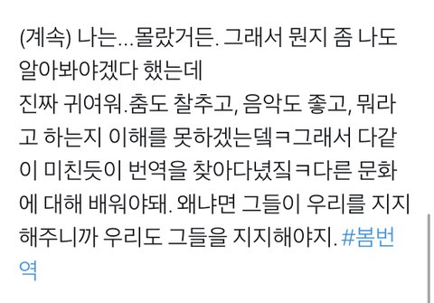 여기 내용과 상관없긴 하지만 애들 탑듀오 본상 받을때 잠깐 그 남미그룹c***있잖아?카메라에 박수치는거 나왓거든~와 통쾌ㅎ왠지는 알지?상받고 메인대접 받고 셀럽들 다들 사진찍고 싶어하고 방탄 언급되고 공연하고 이거 다 떠나서 팬아미들 함성 듣고 좀 많이 부러워했을거 같단 말이지ㅎ
