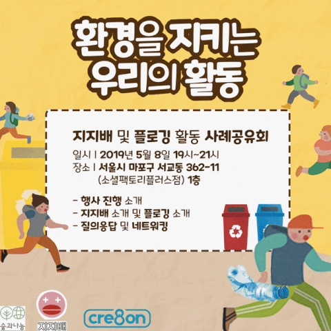 <행사> "환경을 지키는 우리의 활동" (Creativethon + 지지배)= 지지배 및 플로깅 활동 사례공유회 * 이 활동은 (주)숲과나눔 풀씨 2기의 예산을 받아 진행 되었습니다.• 풀씨 진행팀 : ( 클리너스, 지지배 ) • 일시 : 2019년 5월 8일 19시 ~ 21시 • 장소 : 서울시 마포구 서교동 362-11(소셜팩토리플러스점) 1층• 회비 : 없음• 후원 : 숲과나눔 • 내용 - 행사진행- 지지배 소개 및 플로깅소개 - 질의응답 및 네트워킹 • 담당번호 : 010-9237-9374(서울운영진)* 다과, 커피제공 *