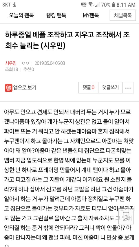 하루종일 베플 조작하고 지우고 조작해서 조회수 늘리는 (시우민)