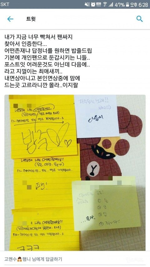 쟤가 저렇게 적어달라했다며. 과하게 까인 감이 없지 않아 있다... 저 이후로 다른그룹도 포스트잇 금지된데 많아졌잖아;;