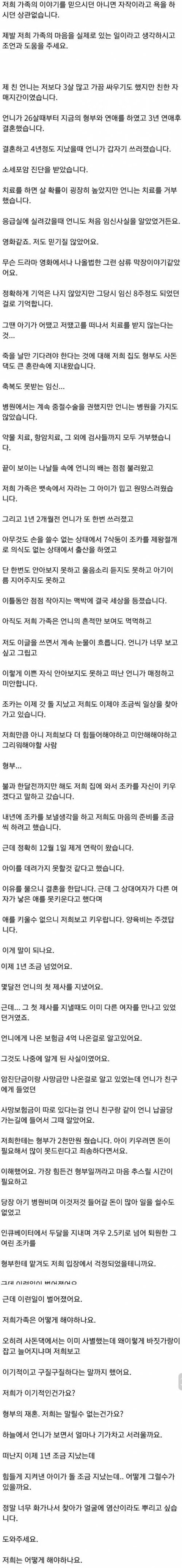 퍼온글이건 남의 글이건 이해가 안감 언니가 금치산자도 미성년자도 지적장애도 아닌데 즉 온전한 제정신인 상태에서 자기 죽을거 뻔히 알고도 출산을 선택했고 누구도 다 알고 있는 상태에서 아기낳고 죽은거죠 형부에게 사망보험금이 얼마 나오고 새로 여자가 생겨 재혼을하고 이건 2차적인 문제로 보임 한마디로 님네 언니 선택으로 님네 집에서 조카를 맡고 있는거 아무도 시키지 않은 일이죠 법적으로도 뻔히 친아빠 있는데 애비한테 보내면 끝날일이고 언니 죽은거 죽은지 얼마 안지나서 형부 재혼하는거 그거 형부 탓이나 원망해봤자 안될일로 보임 믈론 당사자 입장에서 당연히 배신감느끼고 싫겠지만 엄연히 형부는 남이고 언니도 없는 상황에서 그쪽에게 암 기대도 안하는게 정신건강에 좋음 냉정한 제3자 입장에선 이렇게 봅니다