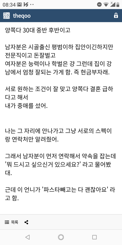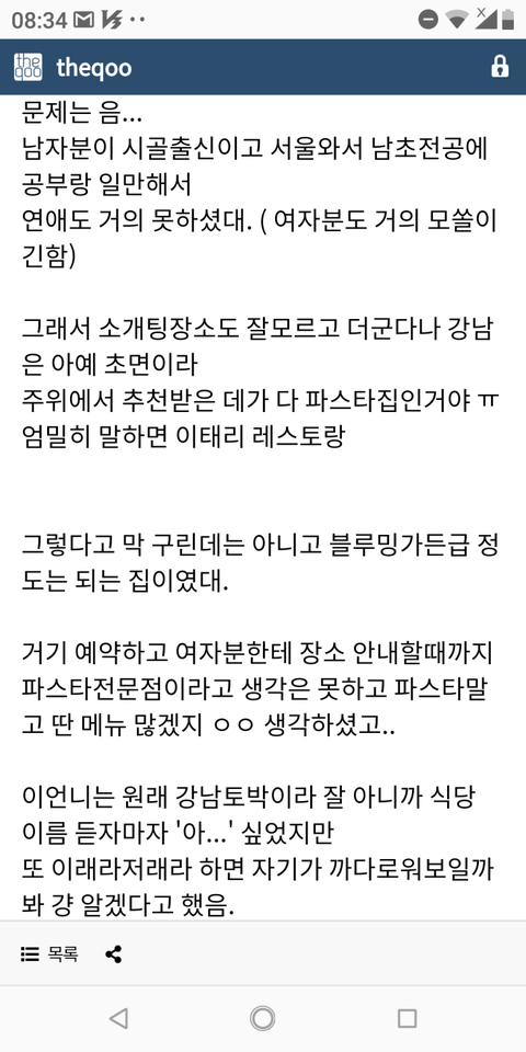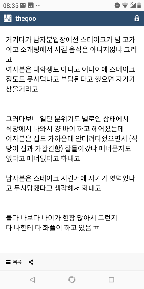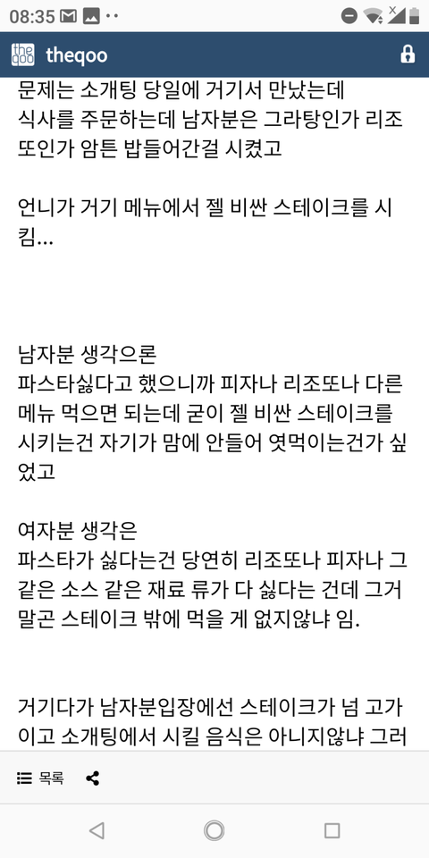여자보단 남자가 ㅂㅅ인데 간단하게 저는 회 스시 못 먹어요 이렜는데 가서 알밥시키면되겠지 하면서 회집이나 일식집 데려가는거랑 뭐가달라? 파스타집에서 보자는 말.거기서부터 일단 나었으면기분 팍 상할거같음. 뭐지 나 무시하니 싶기도하고.남자가 연애 못해본거도 맞는데 ㅈㄴ 눈치없고 융통성도 없고 그 와중에 비싼 스테이크 시켰다고 부들대는거보니..답 안 나오는 스타일같다 남자가 문제.