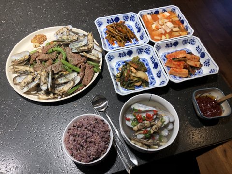 한우안심구이 맛조개버터구이 맛조개탕 그리고 김치들