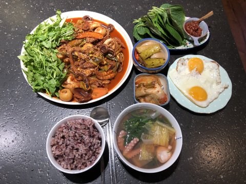 연포탕 끓이고. 쭈꾸미 깻잎에 싸먹고 양념에 밥 비벼먹고