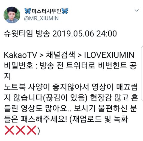 TV 채널: ILOVEXIUMIN 으로 검색 비번: 방송 전 힌트 twitter로 공지