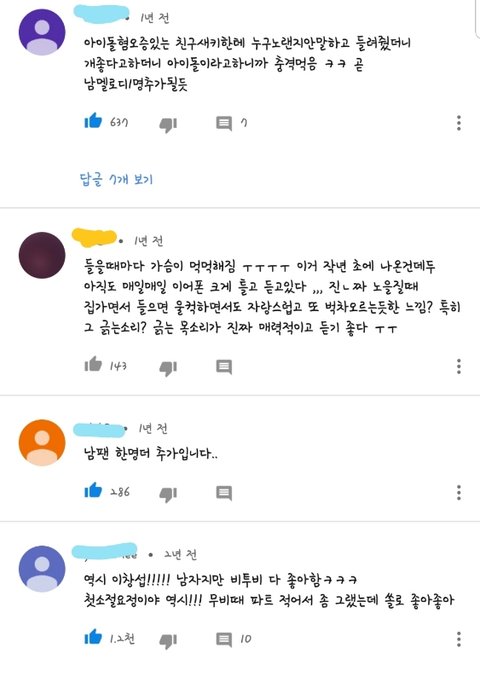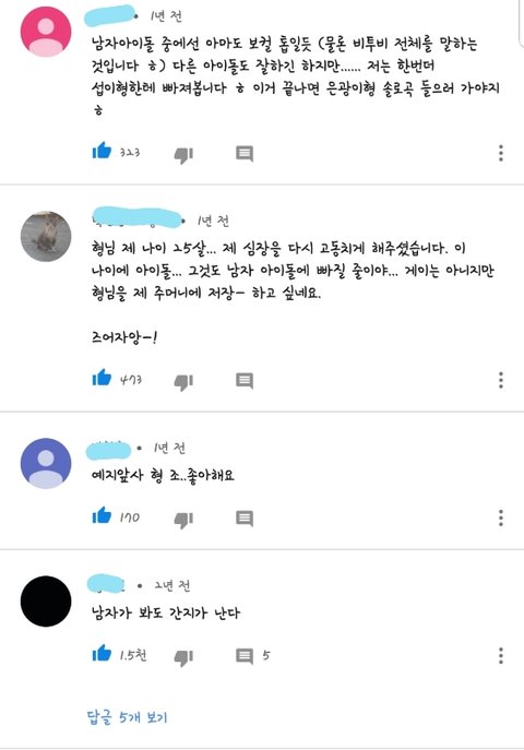내가 일부러 막 찾은게 아니라 댓글보다가 많이 보여서 캡쳐해봤어ㅋㅌㅋㅋㅋ 내가 본 남돌 영상중 남팬 제일 많은듯 ((주관적이야!!)) 오랜만에 At the end 들으러 가야지ㅋㅋ 저거두 좋고 way랑 틈도 좋으니까 한번씩 들어봐바! 예지앞사♡