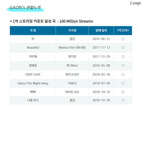 새로 가온 1억 스밍 달성 리스트 갖고옴ㅇㅇ