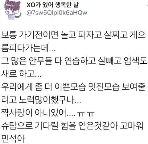 자신의 모든 모습을 솔직하게 전부 보여주고 팬들과 함께 보낼 단 하루를 위해 예쁘게 염색도 하고 밤낮으로 안무연습해서 오로지 시우민만의 무대를 준비해준 내사람